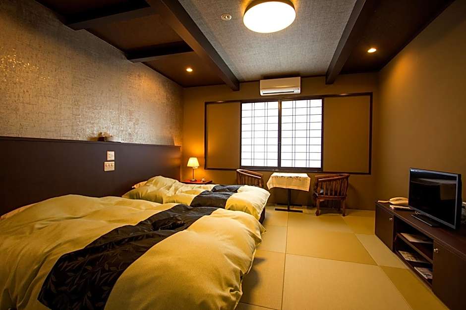 The twin/double room offers air conditioning, tatami, as well as a shared bathroom boasting a bidet and a hairdryer. The twin/double room features a tea and coffee maker, a dining area, a safe deposit box, yukata, as well as a flat-screen TV. The unit has 2 beds.